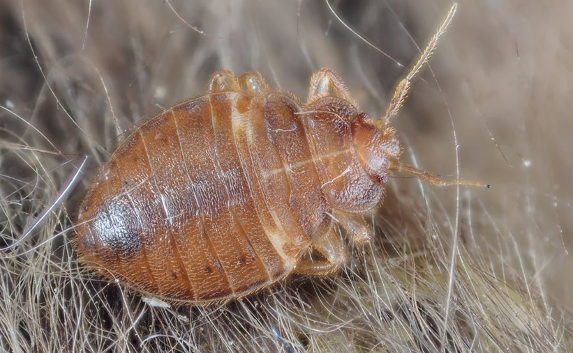 Common bed bug (Cimex lectularius) Adults, 5mm long; reddish-brown in colour, becoming purple after feeding; well-developed antennae; prominent, simple eyes; feet clawed so can climb rough but not smooth surfaces; ratio of head width (including eyes) to length of third antennal segment usually greater than 1.7